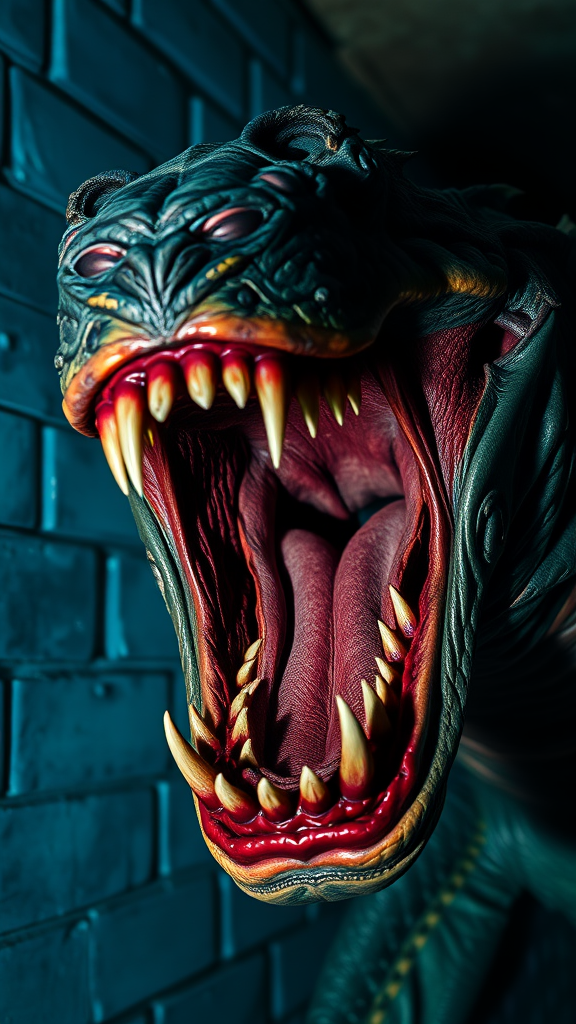 A detailed close-up of a menacing creature with its mouth open, inspired by film key art, in the style of Charles Fremont Conner. The image features a vivid blue wall as the backdrop, emphasizing the creature's sharp features and dynamic pose. The background is dark and contrasts with the bright elements, adding a mysterious vibe. This full-body portrait captures the moment just before a bite, set within a dimly lit sewer, with detailed textures and vibrant colors, maintaining a dramatic yet captivating atmosphere. The portrait is suitable as a 1024px profile picture, embodying a blend of realism and artistic flair.