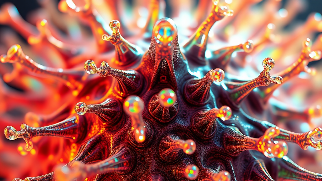 A detailed close-up of a spike surrounded by an array of transparent, colorful spikes, rendered in the style of vray tracing. The design incorporates intricate molecular patterns with twisted branches and a touch of holography. The surface is sculpted with a ZBrush texture, blended with foampunk aesthetics, creating a luminous sfumato effect. The composition captures a raw, surreal quality, with the aspect ratio maintained at 9:16.