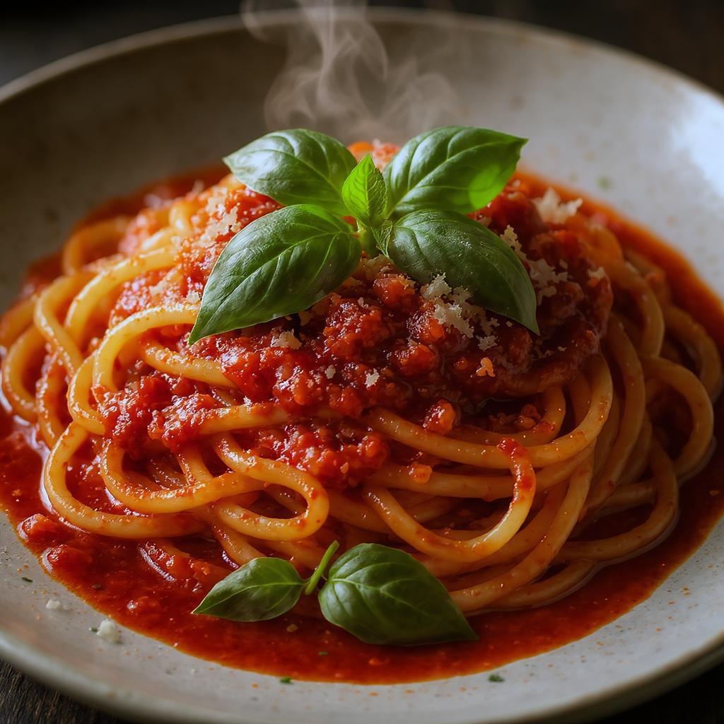 A detailed close-up of a steaming plate of spaghetti drenched in rich marinara sauce, the glossy strands glistening under soft lighting, garnished with fresh basil leaves and a sprinkle of shaved Parmesan cheese, the vibrant reds and greens contrasting vividly, in the style of high-end culinary photography, capturing the textures and depth with a hint of artistic flair in a dynamic elongated frame.