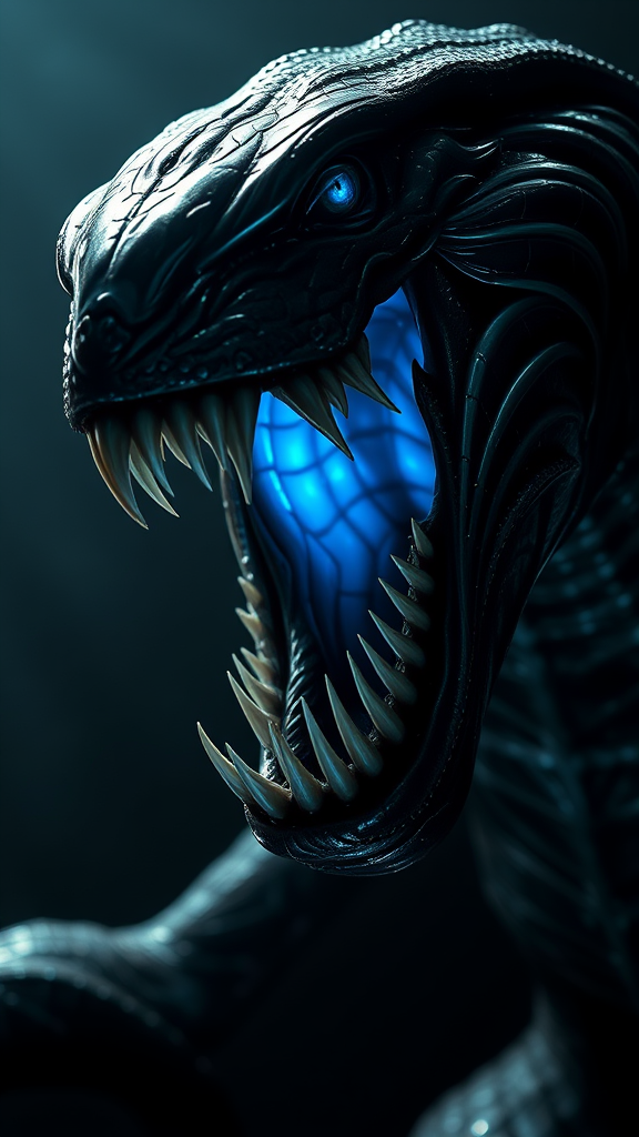 A detailed close-up of a venomous creature with its mouth open, inspired by Charles Fremont Conner's style, film key art. The creature is set against a clear dark background, emphasizing its intricate textures and features. The lighting highlights bright blue reflections on its sleek, muscular body, visible as it emerges from a shadowy sewer environment. The scene captures the moment just before a ferocious bite, showcasing sharp fangs and a menacing gaze. The portrait, designed for a 1024px profile picture, maintains a sense of intensity and suspense.
