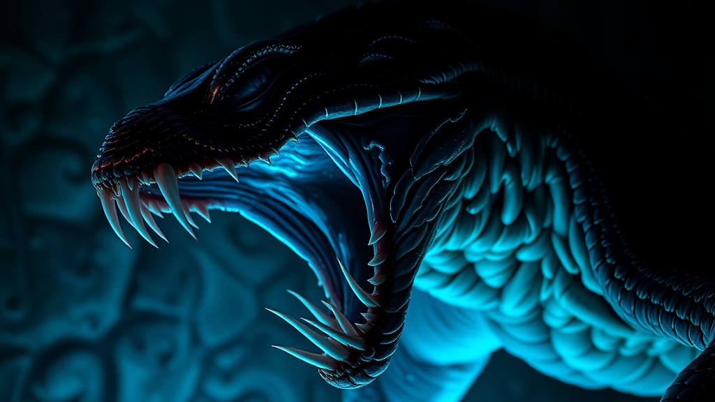 A detailed close-up of a venomous creature with its mouth wide open, inspired by the style of Charles Fremont Conner, set against a clear dark background. The artwork features a profile composition with dimensions of 1024px, capturing the creature's full body in vibrant detail. The scene is artistically illuminated by a bright blue ambiance, suggesting a sewer environment. The creature's menacing bite is a focal point, embodying both tension and mystery. The overall piece maintains a cinematic quality reminiscent of film key art while incorporating unique artistic elements.