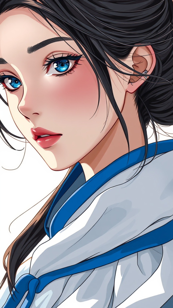 A detailed close-up of a woman in a flowing white dress adorned with a striking blue collar. Her expression is serene and captivating, reminiscent of a knights of zodiac heroine. Her eyes sparkle with a retro anime allure, capturing the essence of an 80s anime style. This portrait draws inspiration from the unique blending of Ilya Kuvshinov's and Artgerm's art styles, resulting in a harmonious fusion of soft lines and striking features. The illustration is a vivid 8k digital masterpiece, showcasing the vibrant colors and meticulous details characteristic of these celebrated styles. Subtle elements, such as a light breeze gently lifting a few strands of her hair, add a touch of dynamism and charm to the composition.
