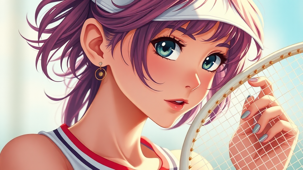 A detailed close-up of a young woman in a vintage tennis uniform holding a tennis racket, reminiscent of a retro anime girl. Her vibrant hair is styled akin to Misty from Pokémon, capturing the essence of 1980s anime art style. The image evokes the nostalgia of retro anime, blending the charm of 80s and 90s anime aesthetics with a touch of realistic 3D flair. Her expressive eyes and dynamic pose embody the spirited energy of the era, set against a softly blurred, pastel-toned background to enhance the retro feel.