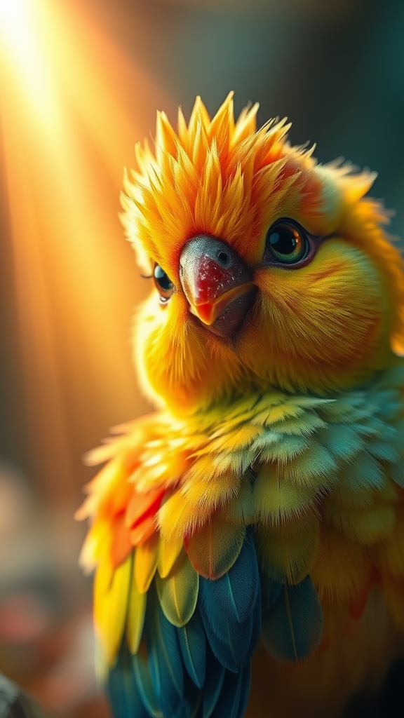 A detailed close-up of an enchanting fantasy bird exuding innocence and playfulness, its feathers a kaleidoscope of bright, vivid colors. The scene is bathed in ethereal, fairy-like lighting with gentle volumetric rays casting a magical glow. The bird's expressive eyes sparkle with curiosity, capturing the photorealism of its youthful charm, all enhanced with HDR effects to highlight its whimsical aura amidst a softly blurred, enchanting background.