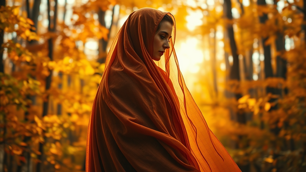 A detailed close-up of an enigmatic woman wearing a burnt sienna veil cloak, gracefully walking through a vibrant autumn forest; each leaf crisp and vividly colored around her, capturing the essence of fall. The photograph boasts exceptional realism, with high-resolution clarity and a professional cinematic angle. Dynamic, golden light filters through the trees, casting an ethereal glow, while soft bokeh enhances the background, drawing focus to the woman’s intriguing presence.