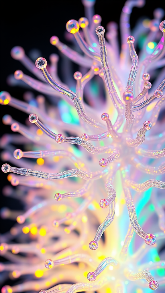 A detailed close-up of an intricate cluster of transparent, iridescent spikes, rendered in the style of V-ray tracing. The spikes intertwine like molecular structures, forming a network of twisted branches with a holographic sheen. Enhanced with the fine craftsmanship reminiscent of ZBrush, the scene is infused with a foampunk aesthetic, blending luminescent sfumato effects. The composition is vibrant, with colors shifting and merging seamlessly, encapsulating a sense of dynamic movement. The vertical aspect ratio accentuates the elegance and complexity of the design, drawing the eye through the labyrinth of refracted light and delicate forms.