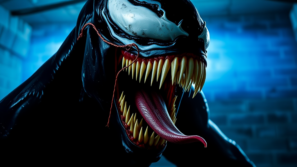 A detailed close-up of Venom with its mouth open, inspired by the style of Charles Fremont Conner, showcasing a dynamic and intense film key art. The image features a menacing full-body portrait against a stark, shadowy background, perfect for a 1024px profile picture. The scene is set in a dark sewer illuminated by a striking, bright blue wall, emphasizing Venom's intricate textures and forms. His sharp teeth and flickering tongue capture the moment of a threatening bite, while subtle adjustments in color and shading create a unique and captivating atmosphere.