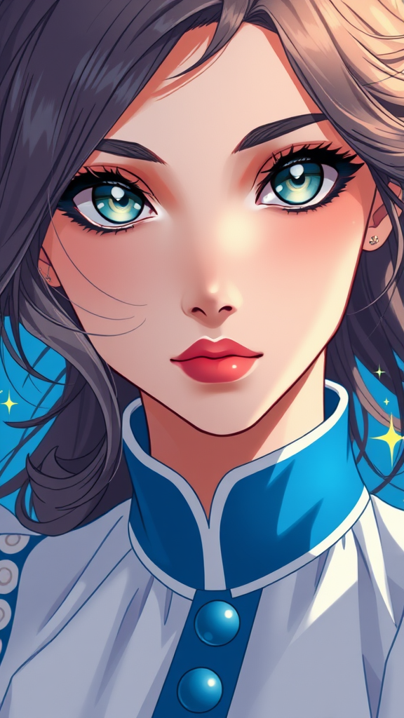 A detailed close-up portrait of a woman wearing a white dress with a striking blue collar, evoking the essence of a retro anime heroine from the Knights of Zodiac. Her features are rendered in a style reminiscent of Ilya Kuvshinov, merging the charm of 80s anime art with modern digital flair. The woman's large, expressive eyes reflect a sense of courage and mystery, surrounded by soft, flowing hair. The artwork incorporates subtle, vibrant shades to enhance her enigmatic presence. In the background, hints of starry elements subtly allude to a celestial theme, complementing her ethereal demeanor. Rendered in 8k, this digital illustration captures the essence of nostalgia and modern artistry in perfect harmony.
