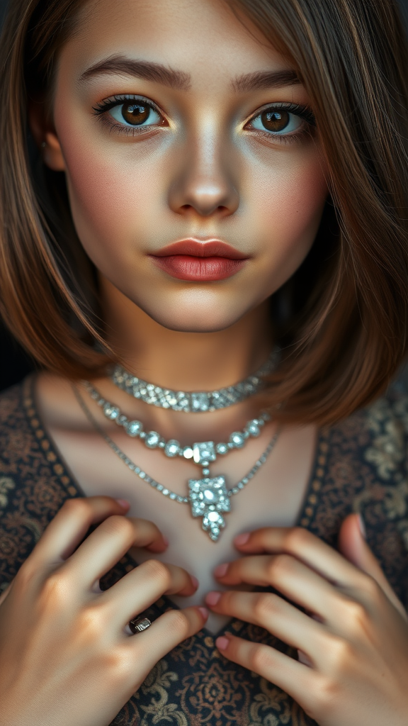 A detailed close-up portrait of a young, stunning girl with soft, natural skin and a long layered bob hairstyle. She has a slim, curvy figure and is wearing an intricate Persian Paisley blouse. Her look is accentuated by exquisite diamond necklaces and rings. The lighting is gentle, emphasizing the elegance and refinement of her appearance, capturing the essence of sophistication and beauty.