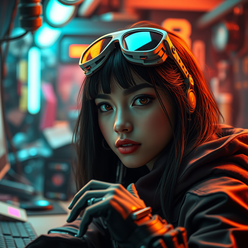 A detailed close-up portrait of an inspired female cyberpunk biohacker at her workspace, showcasing a vibrant and intricate atmosphere. The scene features a sharp focus and crisp detail akin to artgerm's style, with volumetric lighting that enhances the high-quality, cinematic feel. Her beautiful face and expressive eyes are complemented by her skillful hands, emphasizing the precision and expertise in her craft. The setting is infused with neon hues, reminiscent of a borderlands aesthetic, and the composition is breathtaking with precise line art and comprehensive detail. Presented in 4k UHD digital art, this image captures the essence of a key visual trending on artstation—an award-worthy representation of futuristic innovation and artistry. The female character’s features and the environment are perfectly harmonized, showcasing neither weaponry nor sunglasses, maintaining a focus on her captivating presence.