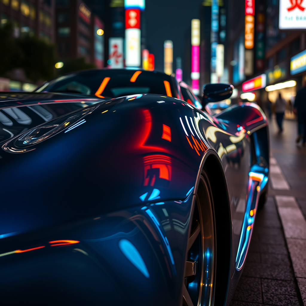 A detailed closeup of a sleek retrofuturistic sportscar glistening under the city lights, showcasing its smooth, chrome body with neon blue accents illuminating its aerodynamic curves, the mirror-finish surface reflecting the vibrant hues of the bustling urban landscape around it, capturing the essence of a bygone era with a modern twist, evoking a sense of speed and innovation.