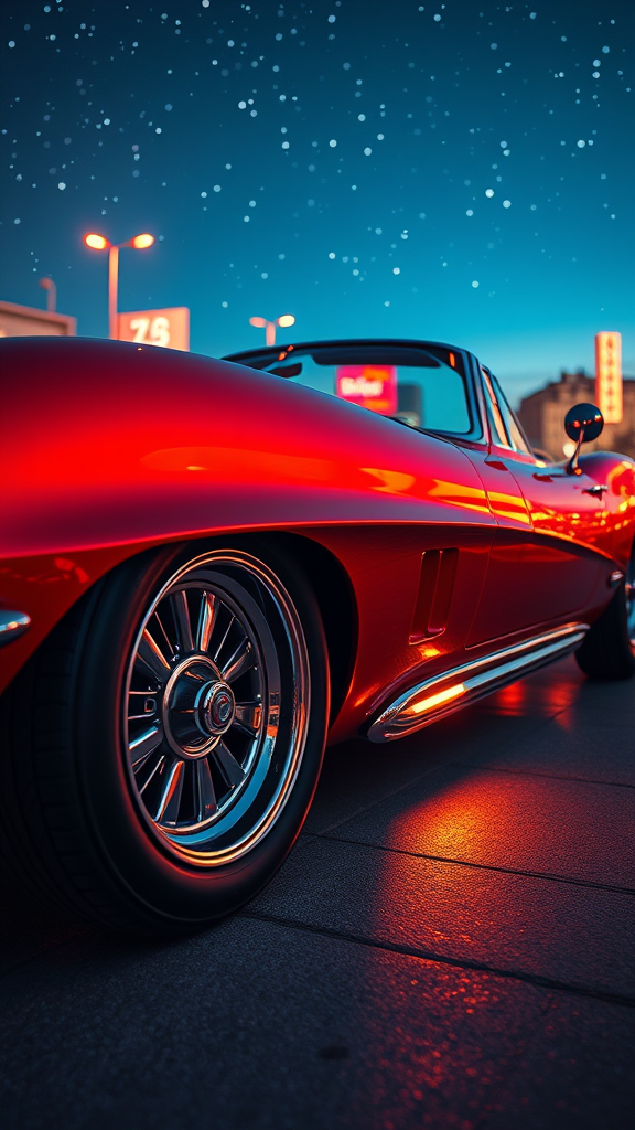 A detailed closeup of a sleek retrofuturistic sportscar, featuring aerodynamic curves and glossy chrome accents that reflect vibrant city lights; its design merges 1960s vintage elegance with futuristic technology, showcasing intricate hubcaps and a streamlined digital dashboard under a starlit sky.