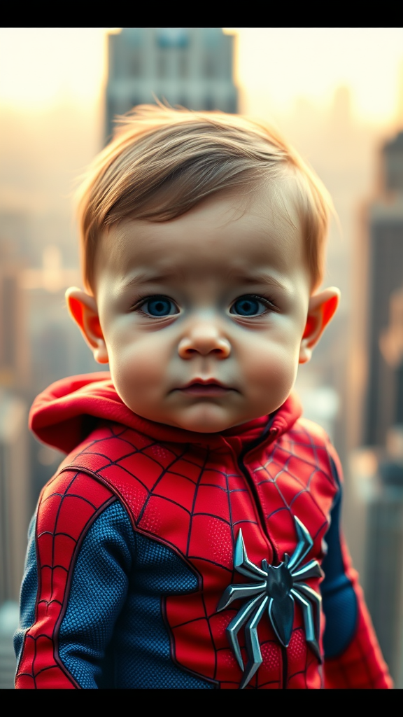 A detailed closeup of an adorable baby Spiderman with a cherubic face, peering out from the iconic Spiderman suit. The suit, slightly oversized, adds a playful charm, with vibrant red and blue hues shining under the soft glow of morning light. The backdrop is a bustling cityscape, slightly out of focus, capturing the essence of skyscrapers and urban life. The photo has a warm, inviting tone, reminiscent of a cozy Lightroom edit, highlighting the innocence and heroic spirit of this tiny web-slinger.