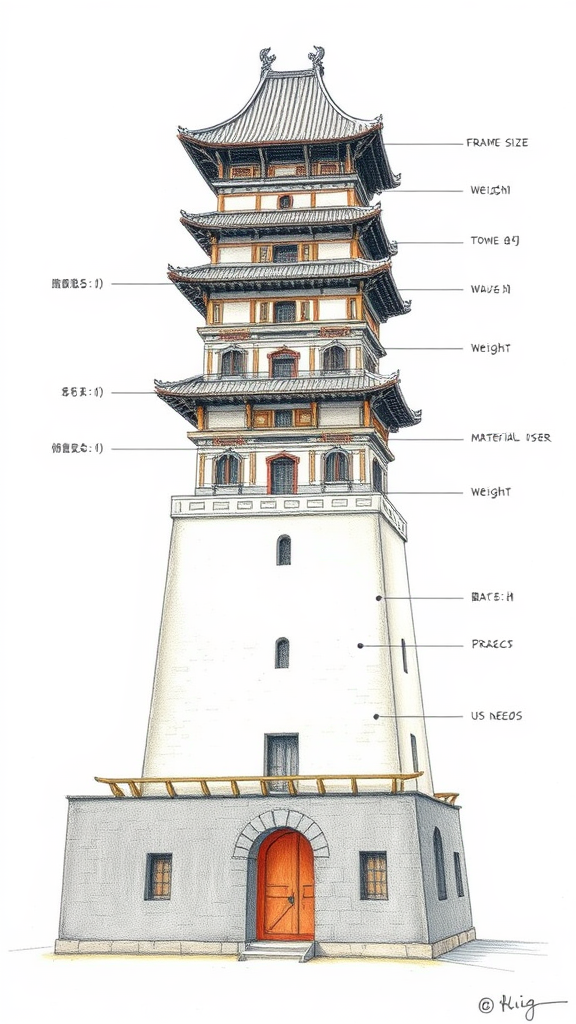 A detailed color pencil illustration of an ancient Chinese tower cross-section, showcasing its intricate construction techniques and design elements with realistic shadows. Each level is labeled to highlight key features such as rooms, bridges, and architectural details. A text panel at the bottom provides information about its historical significance, including frame size, dimensions, height, weight, materials used, form structure type, construction technology, and user needs, accompanied by related drip icons. The tower stands against a white background with a slightly artistic interpretation to give it a unique yet authentic feel.