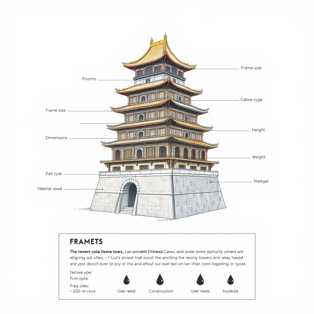 A detailed color pencil style illustration of a cross-section of an ancient Chinese tower, featuring realistic shadows to enhance depth. Each level is labeled to highlight key features such as rooms, intricate bridges, and unique architectural details. A text panel at the bottom provides information about the tower's historical significance, including frame size, dimensions, height, weight, and materials used. It also covers the form structure type, construction technology, and user needs, accompanied by drip icons to symbolize related concepts. The design captures subtle creative elements while maintaining the core essence of ancient Chinese architecture, all set against a clear white background.