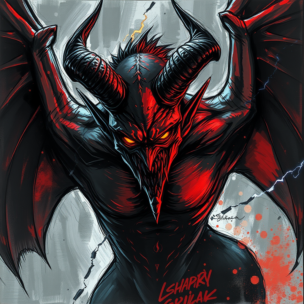 A detailed concept art piece showcases a menacing male demon, its form enveloped in swirling shadows and fiery hues. The demon's skin is textured with a blend of scales and sinew, each line etched with care, revealing a creature born of nightmares. Its eyes glow with intense malevolence, contrasting sharply against the darker tones of its elongated, angular face. Jagged horns twist upwards from its forehead, casting chaotic silhouettes behind it. The demon's wings spread wide, their leathery expanse crackling with energy, caught in a dynamic pose that suggests imminent flight or attack. The brush strokes are wild and frenetic, reflecting the tumultuous spirit of late 20th-century art. The color palette is a dramatic interplay of blacks, deep reds, and stark whites, with occasional flashes of electric blue, imbuing the artwork with a sense of explosive movement and dark drama. This art piece captures the terrifying beauty of chaos embodied, alive with sinister grace and power.