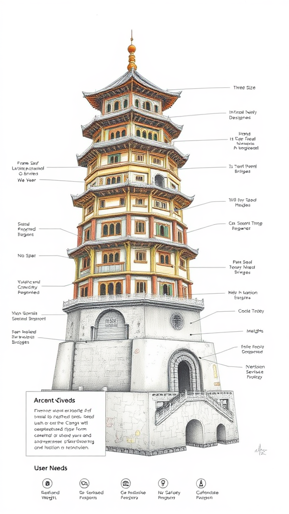 A detailed cross-section of an ancient Chinese tower is illustrated in a color pencil style, showcasing construction techniques and design elements with realistic shadows. Each level is labeled to highlight key features such as intricately designed rooms, connecting bridges, and unique architectural details. A text panel at the bottom provides information about its historical significance, including the frame size, dimensions, height, weight, materials used, form structure type, and construction technology. It also addresses user needs, accompanied by related icons. The illustration is set against a white background, with a slightly creative interpretation to maintain the essence of the original concept.