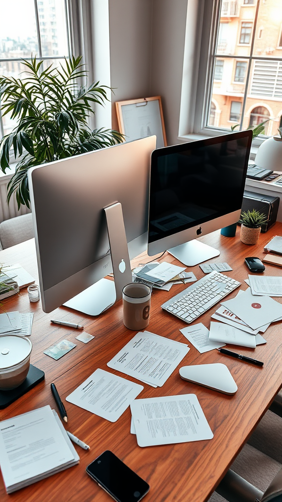 A detailed depiction of a well-lit modern office showing two computer monitors on a wooden desk, one iMac Pro and another sleek monitor, surrounded by an array of scattered papers, a coffee cup, and stationary items, with a potted plant adding a touch of nature. The image is captured with a wide-angle perspective, emphasizing the spaciousness and organized chaos of a busy workspace.