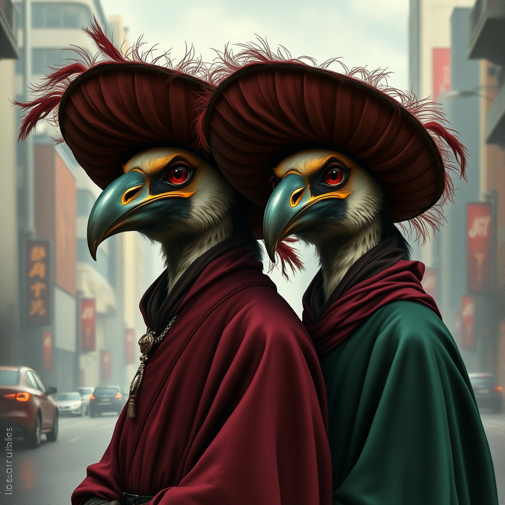 a detailed depiction of two individuals dressed in elaborate cloth hats and flowing robes, influenced by the style of realistic animal portraits, utilizing unreal engine aesthetics with a neo-renaissance flair; the color palette features rich maroon and deep emerald tones with a prominent avian theme; set against a bustling city backdrop that adds to the charm of these captivating characters, the composition captures their essence with precision and beauty, while maintaining an artistic ratio reminiscent of imaginative portraiture