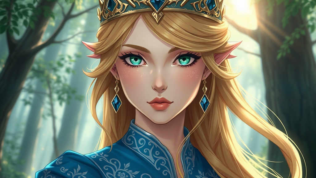 A detailed digital anime art portrait of a woman with captivating emerald eyes, wearing an elegant azure gown adorned with intricate silver embroidery, and a regal crown set with sapphires resting on her flowing golden hair. She embodies the essence of a celestial warrior, reminiscent of the knights of the zodiac. Her expression is one of serene determination, akin to a reimagined Princess Zelda, blending classic fantasy elements with modern anime illustration. The artwork captures her in a mystical forest, where rays of sunlight filter through the foliage, highlighting the intricate details of her attire. The style reflects the ethereal beauty and delicate craftsmanship seen in "Breath of the Wild," with a focus on clean, exquisite linework and rich, vibrant colors.