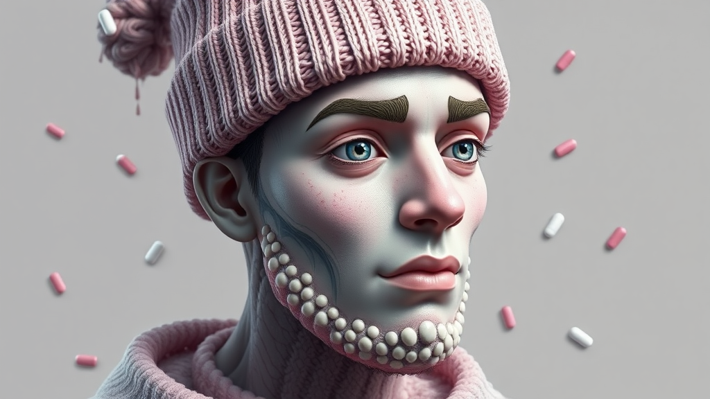 A detailed digital art portrait of a person wearing a textured beanie, drawing influence from Kubisi style and neo-dada elements, resembling a Behance contest winner concept. The character is an imaginative 3D design with attributes akin to a Walter White Fortnite skin, presenting an intriguing fusion of a bubblegum-textured body enveloped in intricate barnacles. The head takes on a whimsical onion-like shape, exuding an elated and whimsical expression. This hyperdetailed depiction portrays a machine-meets-human aesthetic, enriched with cute, eye-catching features. Scattered pills add a surreal touch, complementing the full-body illustration. The artwork captures the essence of a modern yet fantastical character with a charming appeal.