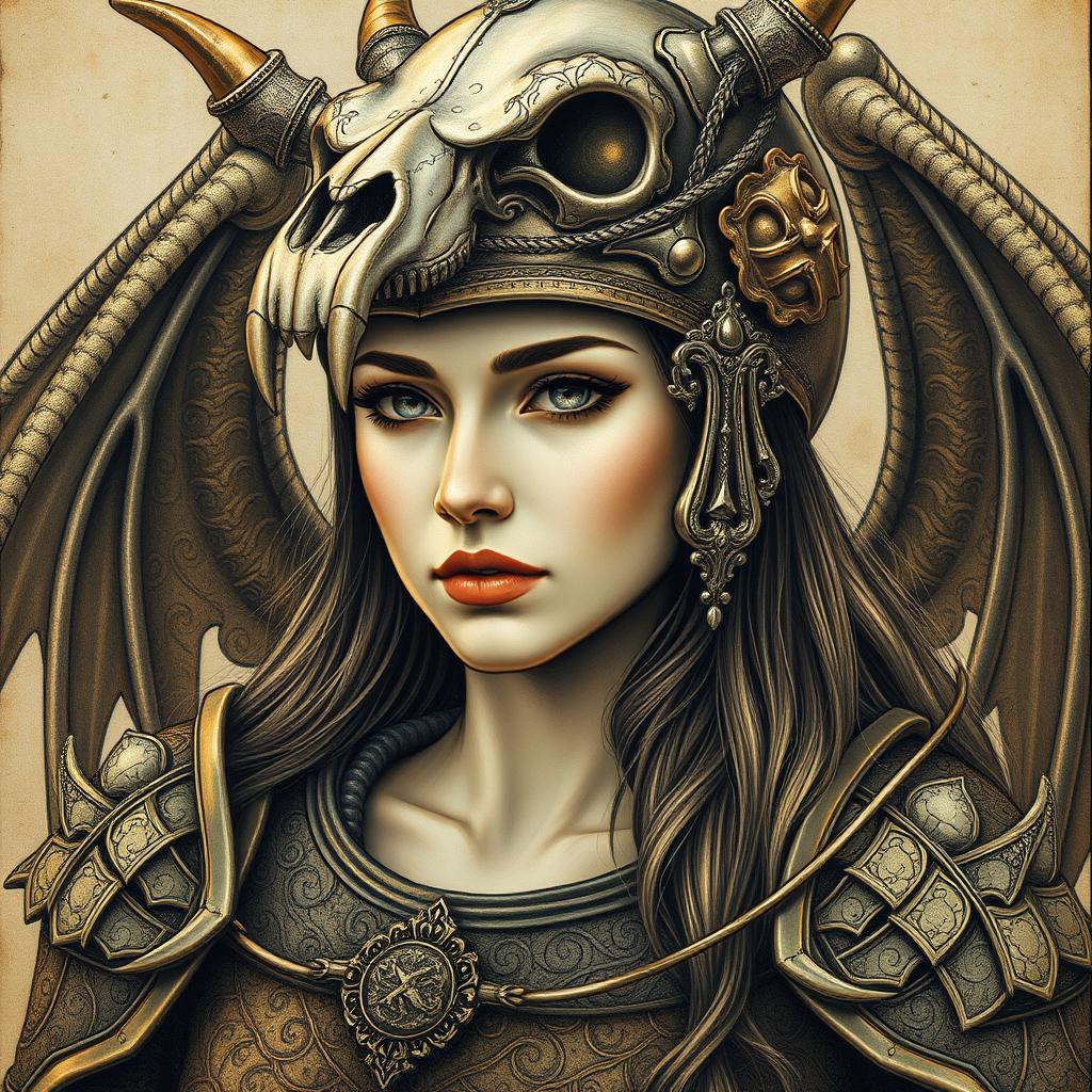 A detailed drawing of a woman adorned with a skull helmet, her expression contemplative and fierce, inspired by the graceful elegance of Pinturicchio; the composition features elements of mythical dragon art intertwined with ornate detailing. The likeness captures the grandeur of large-scale portraits, infused with the warm tones of light bronze and bronze which accentuate her figure. Intricate engraved line-work decorates her armor, drawing influence from Jessie Arms Botke. Her poise is commanding, standing amidst a backdrop suggesting a fusion of renaissance opulence and mystical symbolism.