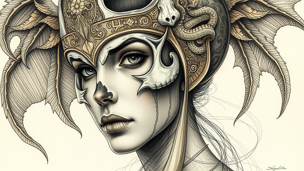 A detailed drawing of a woman wearing an intricately designed skull helmet, featuring ornate engravings and dragon motifs, rendered in a style reminiscent of Pinturicchio and Jessie Arms Botke. The portrait is large-scale, emphasizing elaborate line-work with a light bronze and bronze color palette, showcasing intricate detailing and artistic flourishes throughout the composition.