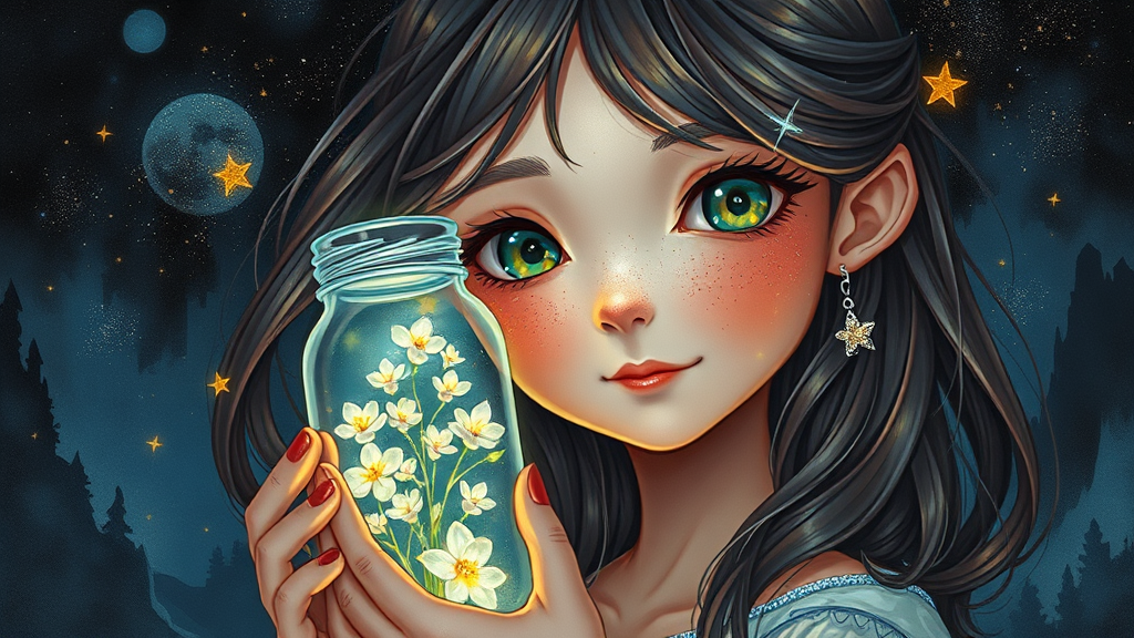 A detailed dreamscape portrait of a girl with a gently smiling face, holding a jar filled with delicate, shimmering flowers that seem to glow softly in the dim light. Her eyes reflect a deep, mysterious nocturnal scene. The illustration features storybook elements with vibrant, glowing colors and multidimensional shading, highlighting her cascading hair adorned with tiny, twinkling stars. She wears whimsical earrings that catch the light, with a subtly dirty face that adds an element of earthy realism. The background is a blend of shadowy, mystical landscapes, enhancing the dreamlike atmosphere. Her graceful posture and serene expression convey a sense of wonder and quiet strength, creating an enchanting and imaginative visual narrative.