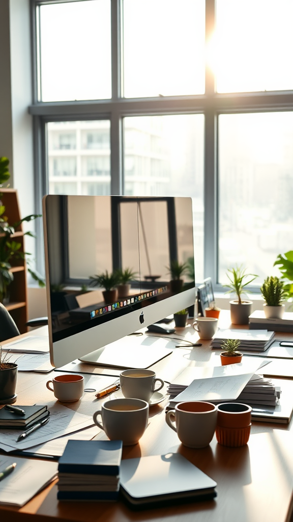 A detailed, evocative image of two computer monitors, an iMac Pro and a sleek ultrawide monitor, positioned on a desk in a sunlit office. The desk is adorned with a variety of papers, coffee cups, and small potted plants, suggesting a busy and dynamic workspace. The wide-angle lens captures the expanse of the room, emphasizing the contrast between the modern technology and the organic clutter. A soft glow filters through large windows, casting intricate shadows that play across the surfaces, contributing to a sense of depth and realness.