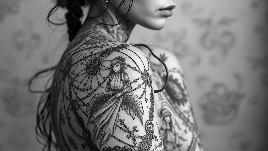 A detailed fantasy art-inspired black and white tattoo on a woman, capturing pensive stillness with lithograph-like qualities, intricately multilayered and appearing as if woven from wire. Bold character designs intertwine with a metafictional narrative, adding an element of storytelling and mystery. The composition blends realism and imagination in a surreal, floating tapestry of interconnected forms and symbols. It is an evocative piece where each element contributes to a profound visual tale, maintaining an air of elegance and complexity.