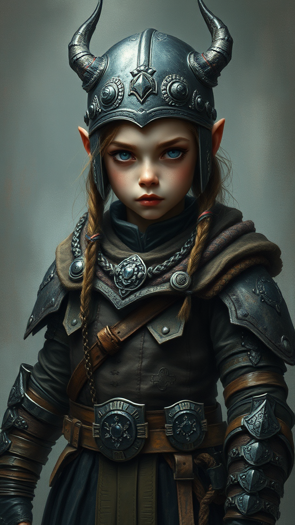 A detailed full body concept art illustration of a small Viking warrior girl in intricate clothing, featuring a dystopian and biomutant theme, painted in a dark, soft-focus style reminiscent of an oil painting on canvas. The scene captures a micro-detailed portrayal of her armor and accessories, rendered in high resolution for clarity. Her expression is fierce and determined, yet subtly softened by the style of the painting. The colors are muted and blend harmoniously, creating a surreal atmosphere. Elements of the scene suggest a post-apocalyptic world, with hints of abstract and fantastical features, maintaining the essence of a Viking warrior. The background is slightly blurred to focus on the character, with a soft haze that adds to the mood. The anatomy is exaggerated in a creative manner, avoiding any extreme deformations, and the overall composition maintains an artistic balance.