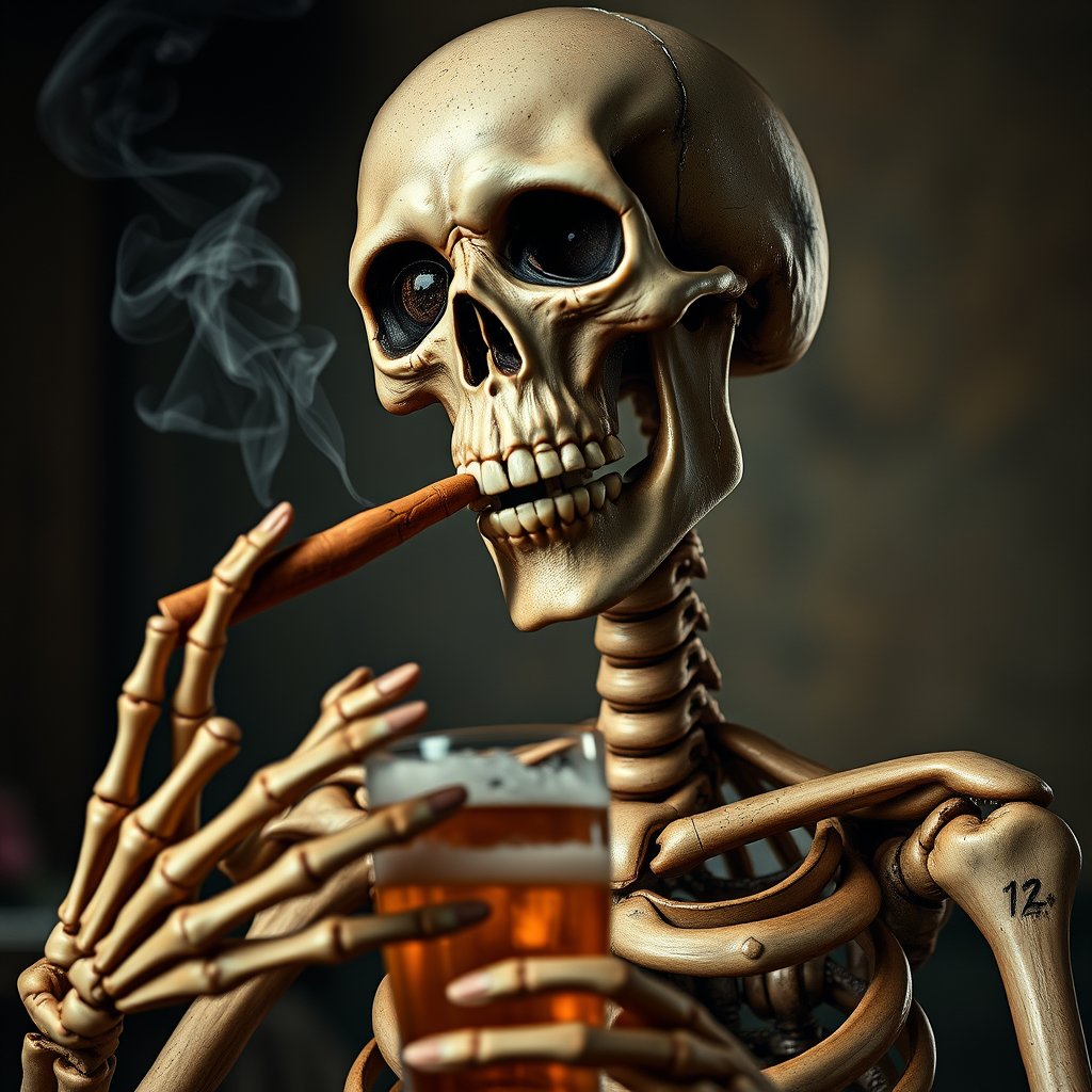 A detailed, high-definition image of a skeleton smoking a cigar with a confident gaze fixed on you, gesturing towards you while holding a beer. The skeletal figure features human-like hands with flesh, skin, and noticeable anomalies such as a deformed iris and pupils, giving it a cross-eyed appearance. Its face appears partially cloned, with extra fingers and mutated hands adding to the eerie aesthetic. The scene has been captured in ultra-high-definition with elements like a long neck subtly framing the composition. The background and surrounding details may contain visual imperfections like cropping, low resolution, and minor artifacts, offering a touch of surrealism. No text, signatures, or watermarks are present to distract from the central figure in this captivating, unconventional portrait.