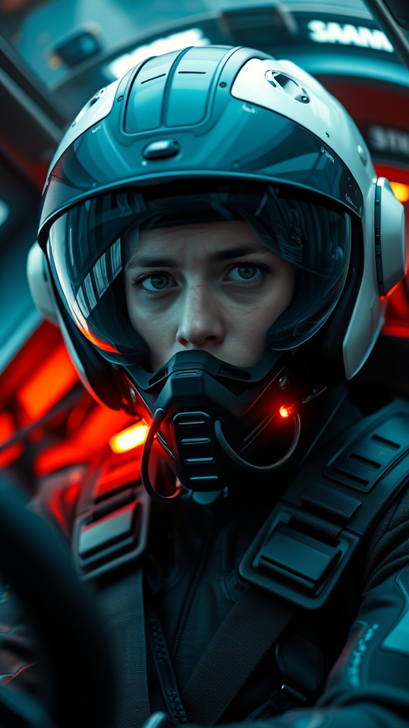 A detailed hyperrealistic portrait of a pilot with a futuristic, fully enclosed helmet, seated in a sleek futuristic cockpit. The pilot is adorned in sophisticated sci-fi armor, gazing directly at the viewer. The scene is infused with a cyberpunk aesthetic, featuring subtle bioluminescent elements that add a mystical quality. The image is centered and composed with cinematic precision, boasting sharp focus and a rich depth of field. The lighting enhances the drama, creating a visually captivating and immersive experience.