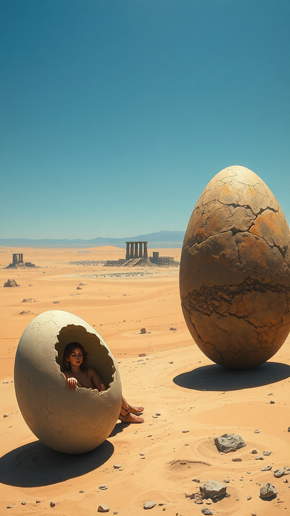 A detailed illustration depicted on ArtStation combines the elegant style of Alphonse Mucha and the imaginative touch of Moebius in a richly textured oil painting reminiscent of John Singer Sargent. The scene features a melancholic figure seated in an expansive desert with two enormous dinosaur eggs beside them. The background reveals an alien planet landscape under a clear blue sky. In the distance, remnants of an ancient civilization are partially visible, their structures partially crumbling, allowing the imagination to ponder their history against the vast, otherworldly horizon.