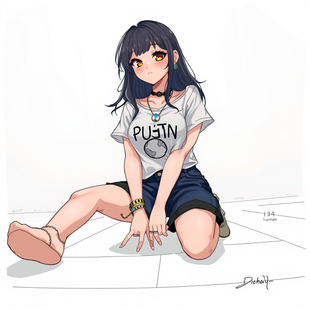 A detailed illustration of a young woman with a curvy figure, wearing a casual outfit featuring a punk-style t-shirt. She looks cute and is kneeling, adorned with moon-themed jewelry. The focus is solely on her, with a perspective view from below, enhanced by volumetric lighting. The image contains low resolution elements, with text and a signature visible, along with a watermark. There are some artistic errors, such as an extra or fewer digits, and the scene appears cropped with some elements being blurry. Additional or missing limbs, fingers, or legs may be present, contributing to a uniquely imperfect and abstract representation, while maintaining an intriguing quality despite perceived flaws.