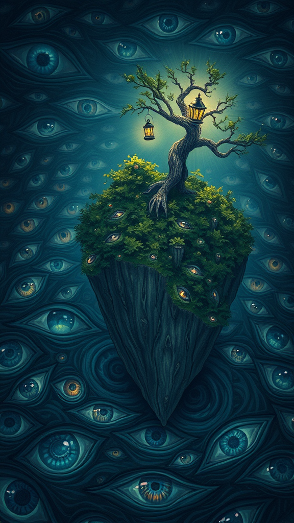 A detailed illustration of an island in an ocean of multicolored eyes, featuring a mysterious creature with a lantern on its head, perched atop a tree. The scene is softly lit with a dark ambiance, showcasing intricate details and an ultra-realistic style. The composition avoids elements such as text, errors, blurry visuals, and poor quality, focusing instead on the surreal and fantastical aspects of this unique environment.