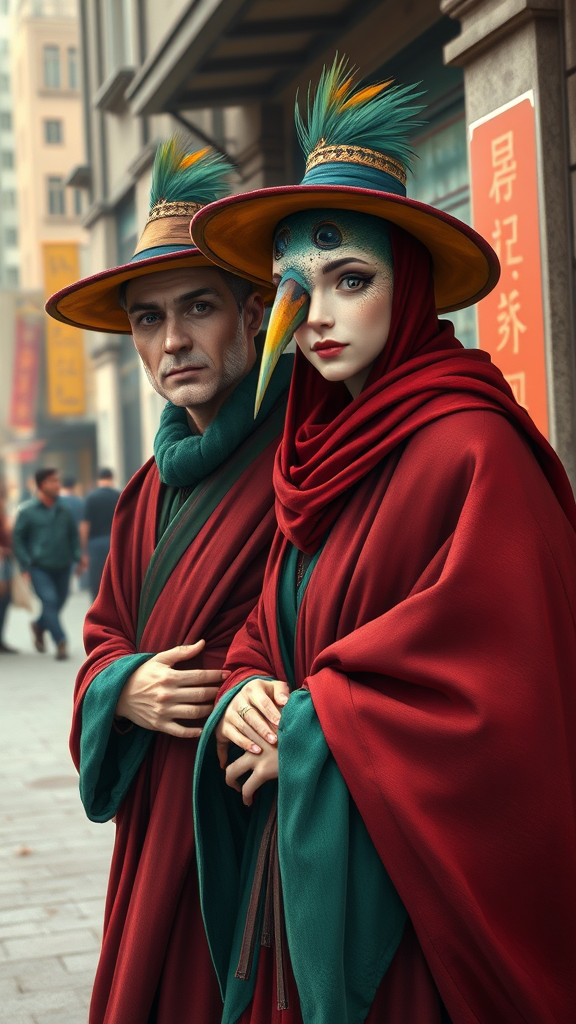 A detailed illustration of two individuals adorned in cloth hats and flowing robes, reminiscent of realistic animal portraits; the scene styled using unreal engine with a neo-renaissance flair. The color palette features rich maroon and vibrant emerald tones, incorporating avian-inspired motifs. Set against an urban backdrop, the portrait captures charming, characterful figures, weaving elegance with whimsical grace.