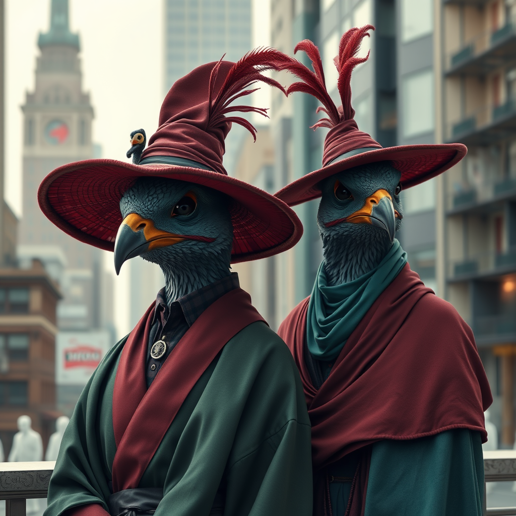 A detailed image capturing two individuals adorned in elaborately textured cloth hats and flowing robes, reminiscent of realistic animal portrait styles, crafted using Unreal Engine with a neo-renaissance flair. The color palette is rich with maroon and emerald tones, echoing an avian theme throughout the cityscape backdrop. These charming characters exude sophistication and playful elegance, blending seamlessly into their vibrant urban surroundings.