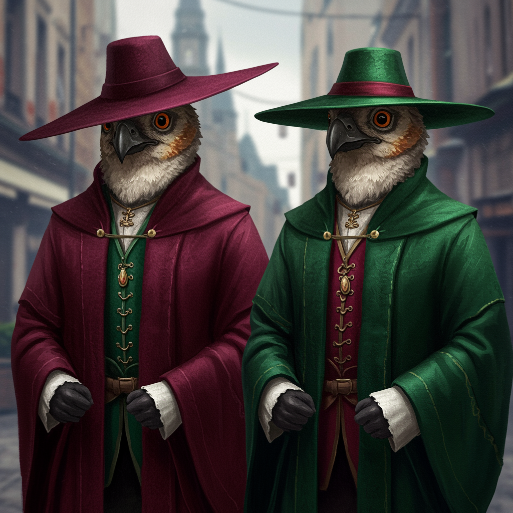 A detailed image depicting a duo adorned in intricately designed cloth hats and robes, drawing inspiration from realistic animal portraits. They embody a neo-renaissance style, with rich maroon and emerald hues intertwining seamlessly. The characters exude an avian-themed aura, gracefully blending into a bustling, urban backdrop reminiscent of city portraits. Their charismatic and charming presence captures a sense of storytelling, immersed in a unique blend of natural and urban elements, all rendered with the precision and artistry akin to a creation in Unreal Engine.