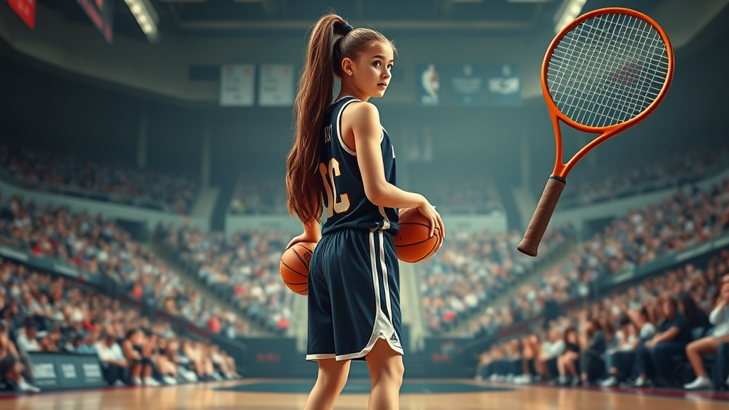 A detailed image of a girl with intricately detailed long brown hair in a high ponytail, standing on a basketball court wearing sportswear and a basketball uniform with a team logo. She is wearing sneakers and has a player number visible. The scene is set in a stadium filled with spectators in the stands. The girl is holding a basketball confidently, and the environment is indoors. The atmosphere captures the essence of a WNBA game. She stands with an athletic posture, exuding confidence and sportsmanship. Despite the vibrant scene, there are slight surreal elements, such as a subtly distorted shadow behind her and an unusual shape mimicking a deformed tennis racket placed innocuously in the background, adding a unique artistic twist to the image.