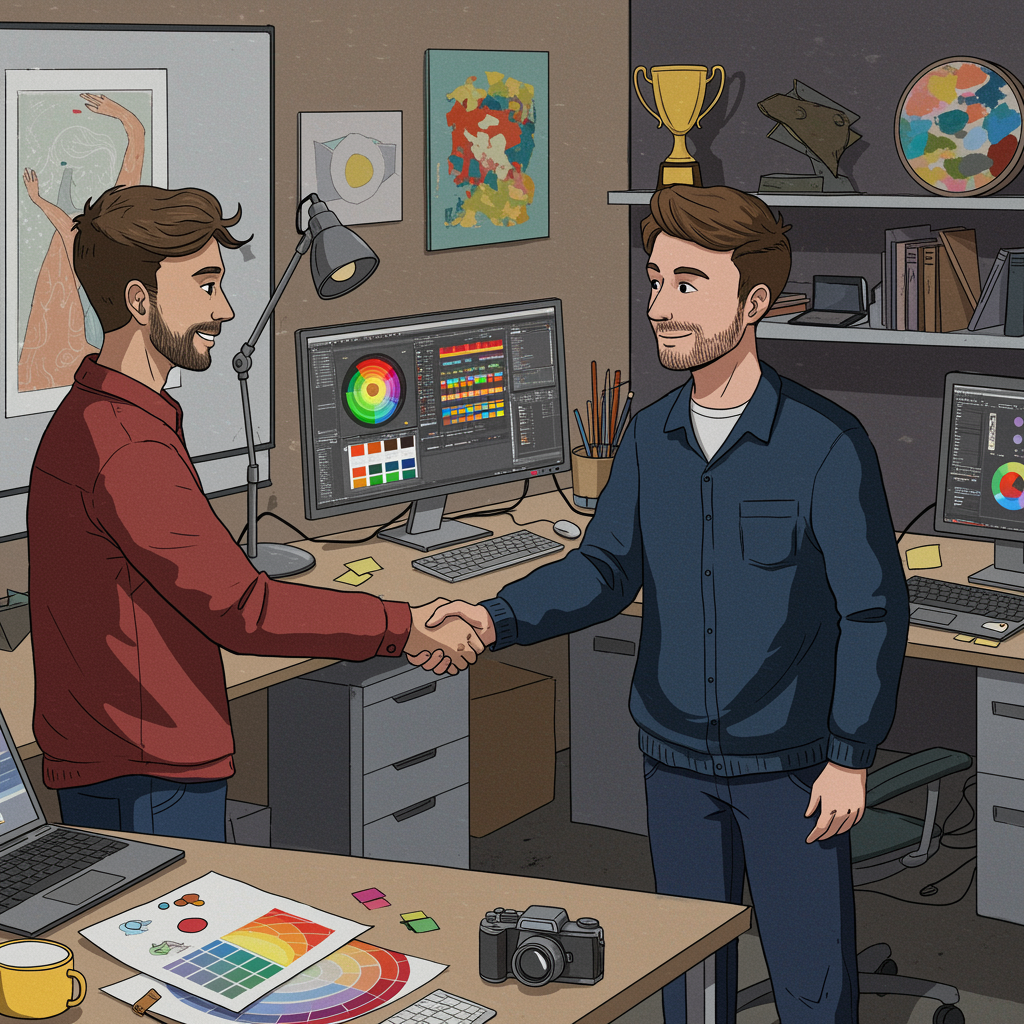 A detailed image of a satisfied client warmly shaking hands with a Graphic Designer in a vibrant Design Studio filled with state-of-the-art technology. The space is adorned with high-end computers, sleek laptops, and professional cameras, showcasing their creative environment. A prominent art prize trophy gleams on a shelf, highlighting a stunning masterpiece hanging on the wall, capturing the essence of success and creativity. The atmosphere is buzzing with innovation and artistic flair, as natural light floods the studio, casting an inspiring glow over the scene.