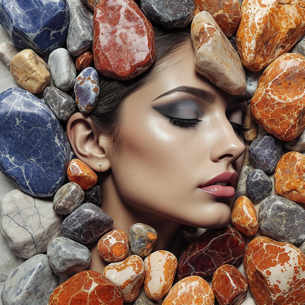 A detailed image of a striking woman subtly blended with an array of stones in different sizes, showcasing elaborate patterns and a spectrum of colors such as deep blues, vibrant reds, warm oranges, and soft grays. Each stone exhibits its own unique texture, ranging from cracked and arid to polished and sleek, contributing to a mesmerizing and tactile visual experience. The harmony of natural designs and contrasting hues results in an intricate and captivating visual tapestry.