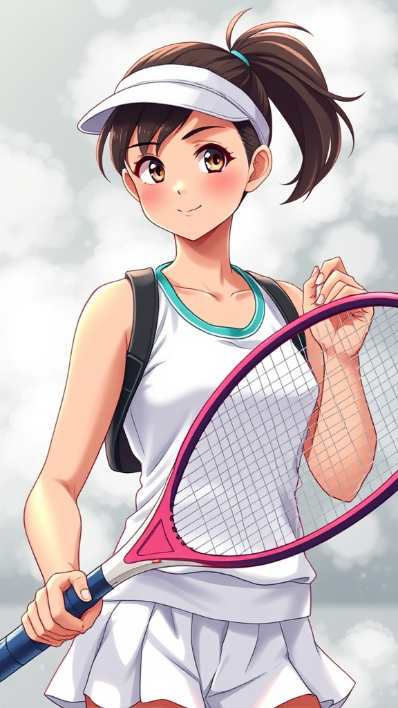 A detailed image of a young woman wearing a vintage-style tennis outfit, holding a tennis racket with confidence, reminiscent of Misty from Pokémon. Her appearance and attire are styled in a classic 1980s anime aesthetic, capturing the essence of retro anime with vibrant colors and bold lines. Her hair is styled in a playful ponytail, and her expression is both determined and cheerful. The art blends elements of 1990s anime with a touch of realistic 3D details, bringing a fresh and dynamic twist to the nostalgic 80s anime style. Mist surrounds her, adding a dreamy, ethereal quality to the scene.