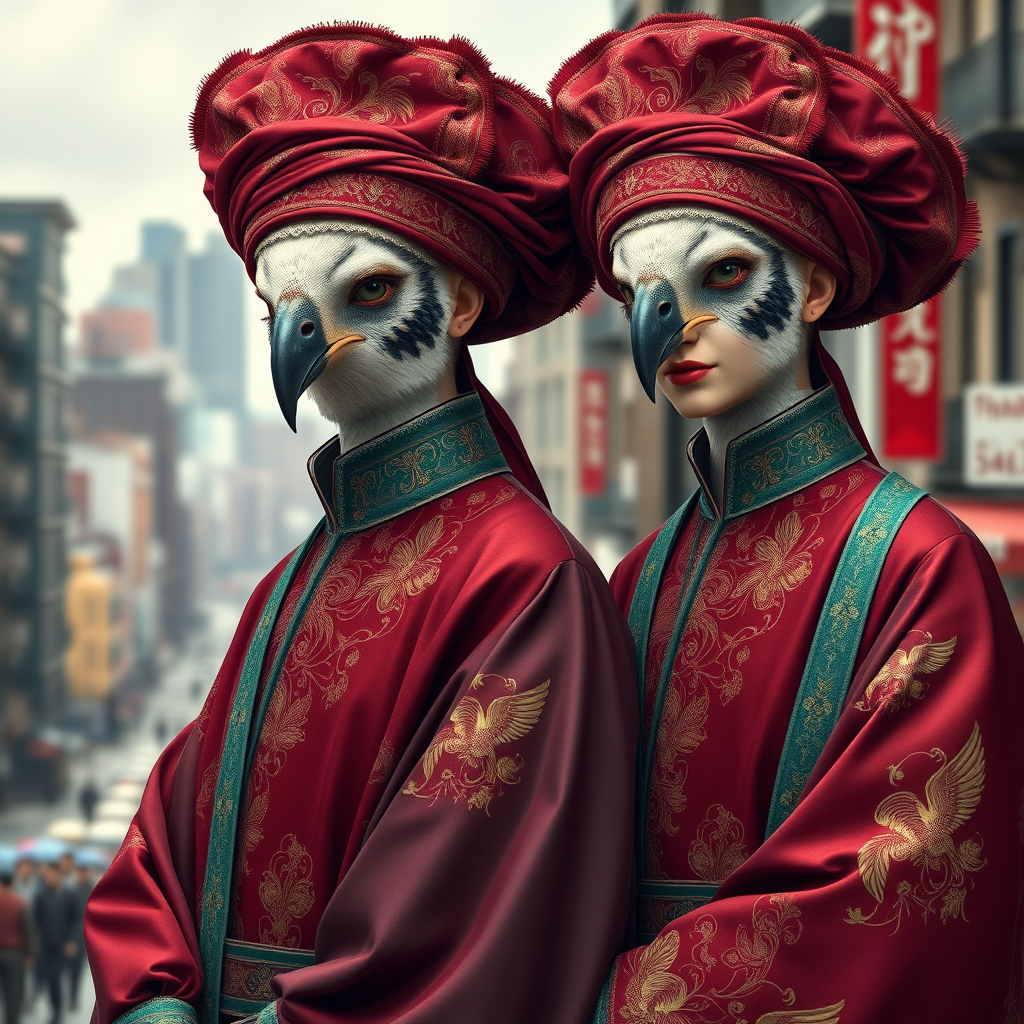 A detailed image of two individuals dressed in ornately patterned cloth hats and flowing robes, capturing the elegance of realistic animal portraits. Styled with the precision of an unreal engine render, the design is heavily influenced by a neo-renaissance flair. Rich shades of maroon and emerald dominate the attire, with intricate avian-themed motifs embedded throughout. The backdrop features a vibrant cityscape that adds depth, enhancing the charming nature of these characters. The scene evokes a sense of harmony between the characters and their urban environment, depicted in proportions subtly adjusted to add a unique visual appeal.