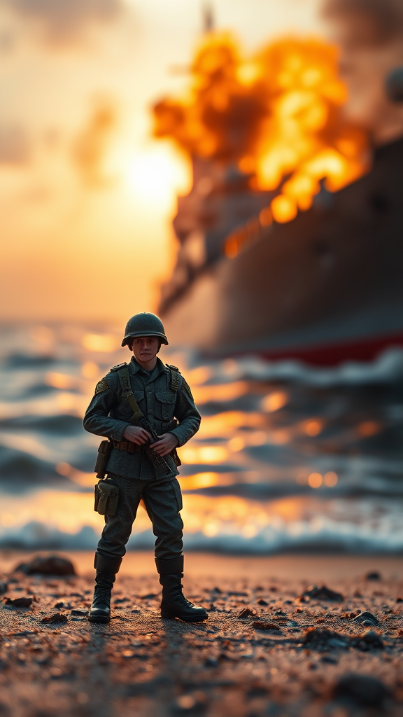 A detailed miniature soldier stands resolutely on a sandy shore, the intricate features magnified as if viewed through a macro lens, set against the backdrop of a massive warship. The ship is engulfed in flames, gradually sinking into the turbulent waters, casting a dramatic glow across the scene. The soft light of a setting sun highlights the somber, yet heroic ambiance of the moment.