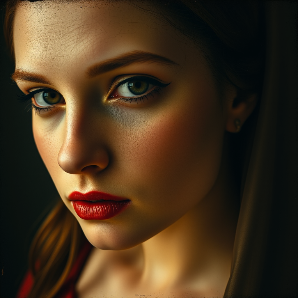 A detailed minimalist avant-garde portrait of a woman, reminiscent of an old Diego Velazquez oil painting, with a grainy texture and an emphasis on the empty eyes, capturing a sense of mystery. The image should be rich in detail, maintaining the classical essence of Velazquez's work but with a modern twist. The aspect ratio is wide, 16:9, giving it a cinematic feel, while pushing the boundaries of realism through a unique stylization that blends historical and contemporary art influences.