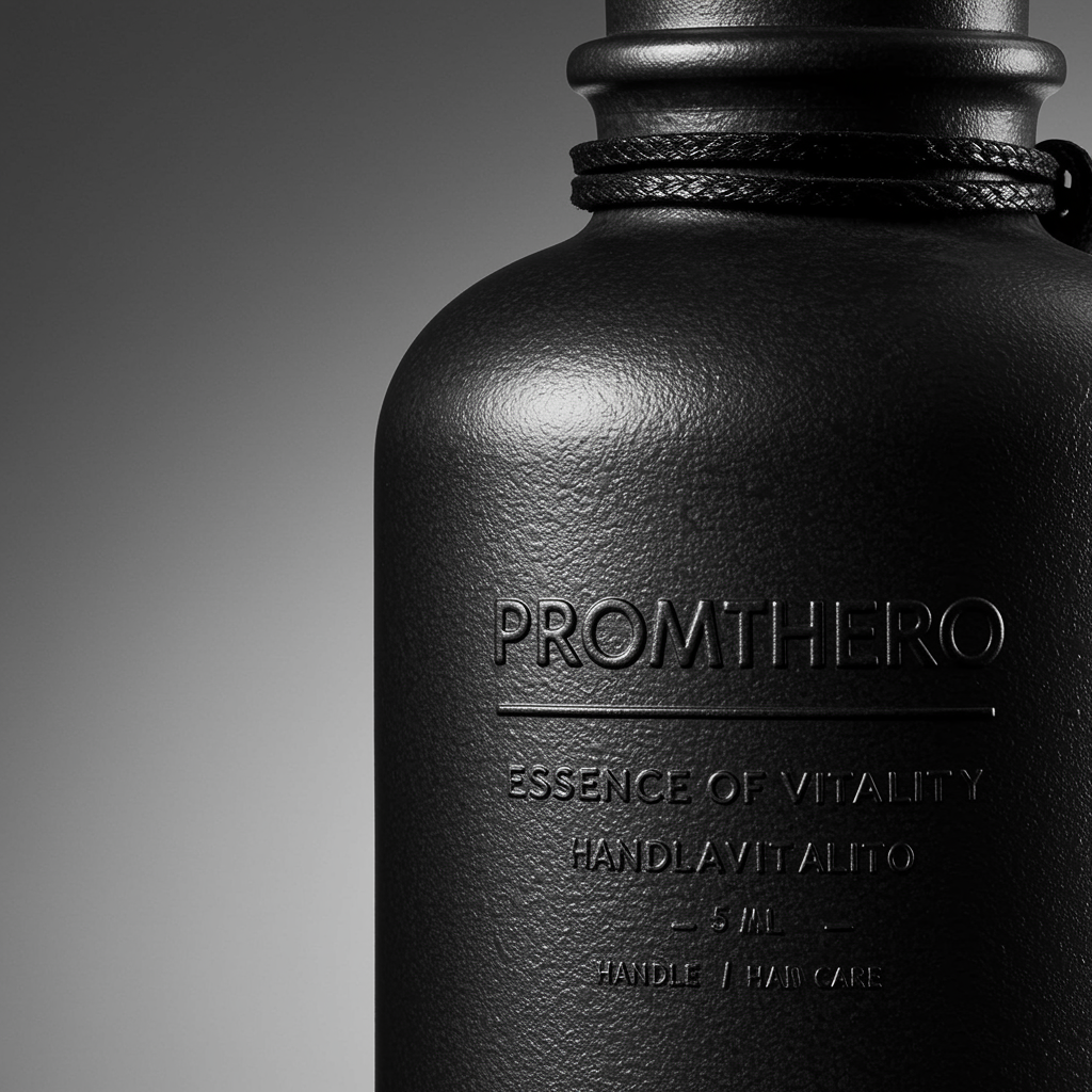 A detailed, monochromatic image captures the essence of a deep charcoal gray bottle with embossed text reading: "PROMPTHERO – ESSENCE OF VITALITY – 50 ML – HANDLE WITH CARE". The lighting is intense, creating gentle highlights and rich shadows that accentuate the bottle's textured, pebbled surface. A thin, black leather cord is wrapped around the neck, imparting a rugged yet sophisticated touch. The left side of the image subtly transitions into a smooth gradient, contributing to a sleek, modern, editorial vibe.
