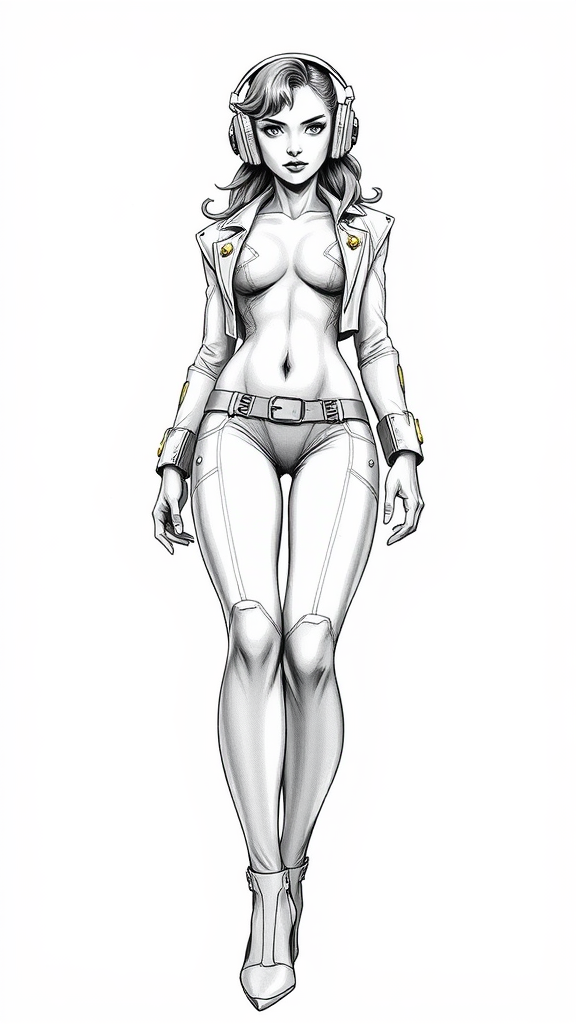 A detailed monochromatic vector illustration of "Dr. Talos," a woman depicted in a low camera angle, full-body view, showcasing an asymmetrical perspective. Rendered in the style of Philip Bond, the image features dithered shading and an inked outline characteristic of comic book drawings. The composition highlights hyperrealism detail on a white background. Dr. Talos is illustrated with glowing elements on her chest, accentuated by a bright light. She wears headphones and stands with a striking presence, characterized by a bare neck, narrow hips, and heels. The scene captures a sense of dynamic energy with a folded torso and carefully rendered anatomical proportions. The background is subtly textured with noise, adding depth to the image. Gold rivets and intricate details accentuate her attire, creating a futuristic and edgy character design. Her expression is focused and intense, with expressive features that convey depth and personality.