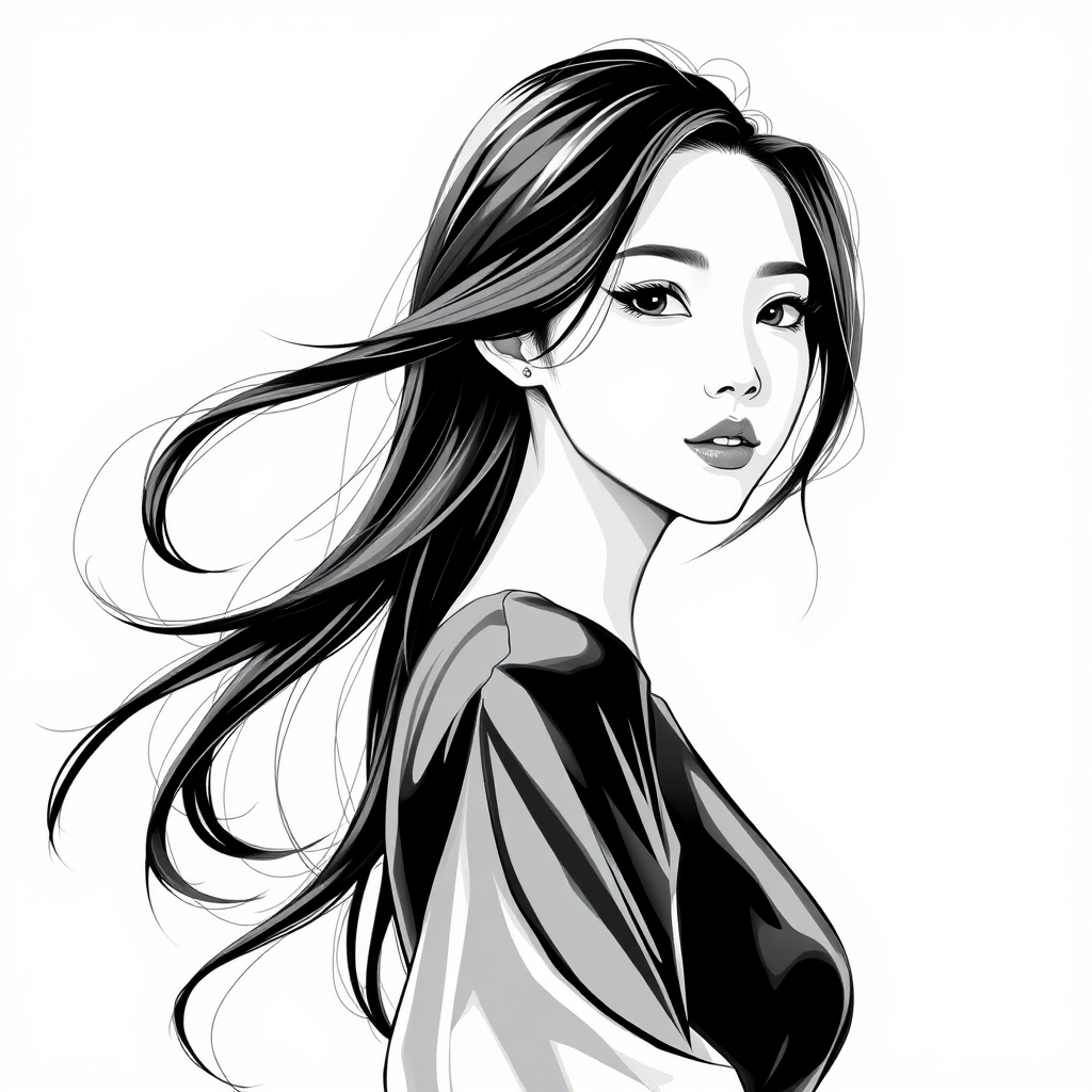 A detailed monochrome illustration of an elegant Korean lady with flowing hair, gracefully posed against a minimalist light backdrop, incorporating subtle artistic variations that enhance her allure and maintain the essence of realism.