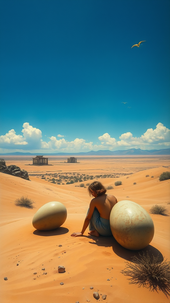 A detailed oil painting portrait inspired by Alphonse Mucha and Moebius, capturing the essence of John Singer Sargent. The scene portrays a melancholy figure seated on the sands of a vast desert, with a pair of enormous dinosaur eggs beside them. Beyond, the landscape reveals an alien planet's exotic terrain beneath a vivid blue sky, punctuated by the distant silhouette of ancient civilization ruins. The composition balances intricate details and emotive elements, creating a unique blend of styles and setting.